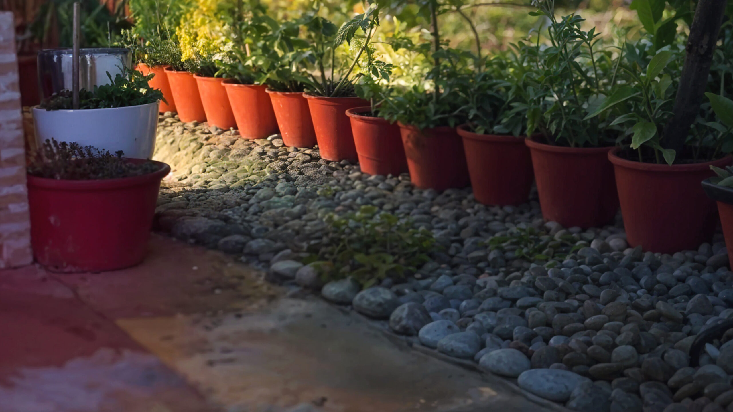 Accent lights highlighting planters and textures