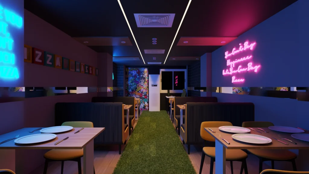 Symmetrical Layout – Balanced dining sections on both sides of a central walkway for an organized, immersive experience. Dim Lighting Ambiance – Strategically placed warm lighting enhances the restaurant’s cozy yet sophisticated atmosphere. Premium Material Selection – A combination of rustic wood, industrial metal, and exposed brick for a raw, urban-chic aesthetic. Neon & LED […]