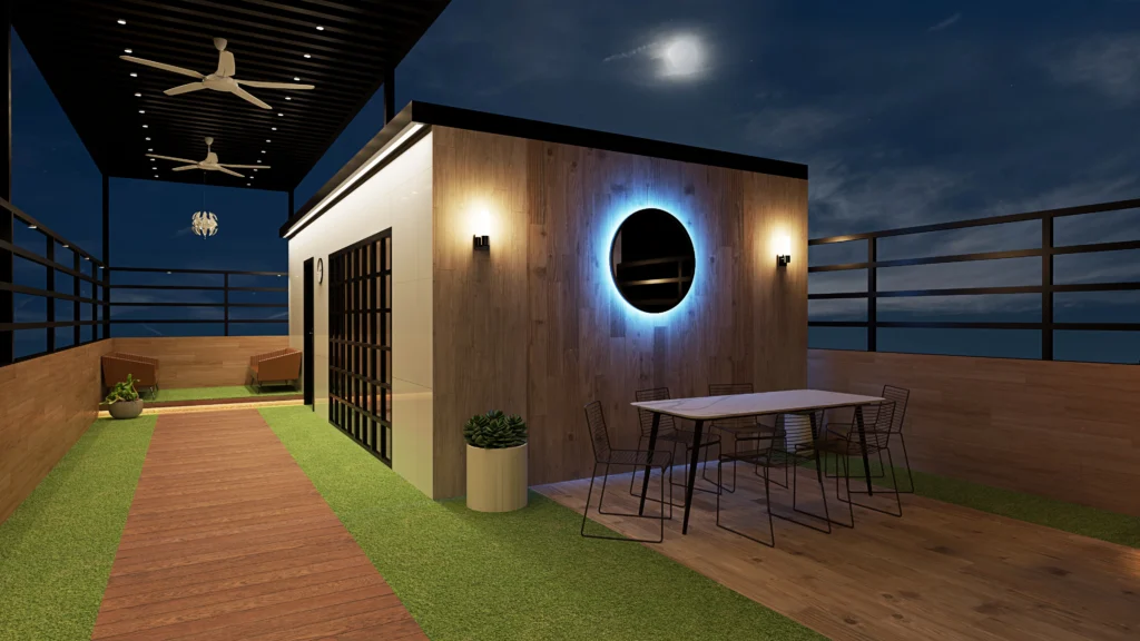 Spacious terrace design with a blend of contemporary aesthetics and functionality Elegant wooden pergola adding warmth and sophistication to the outdoor space Integrated greenery and landscape lighting for a fresh and inviting atmosphere Premium outdoor seating area designed for relaxation and social gatherings Compact yet stylish kitchen with smart storage and modern appliances Sleek black […]