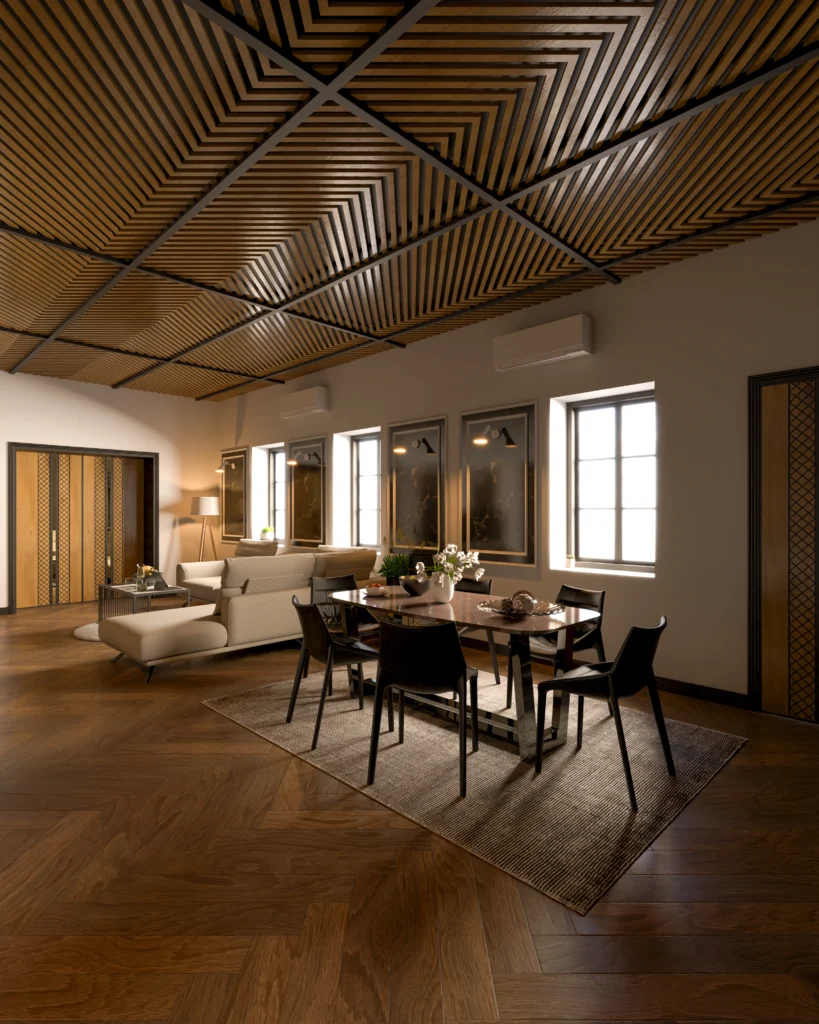 Custom wooden ceiling design with integrated LED strip lighting for a dramatic overhead feature. Premium herringbone wooden flooring enhances visual richness and adds timeless warmth. Modern neutral-toned sofas paired with minimal coffee table for an elegant seating layout. Wall-mounted art frames and architectural paneling deliver a refined decorative touch. Recessed ceiling lights and chandeliers together […]