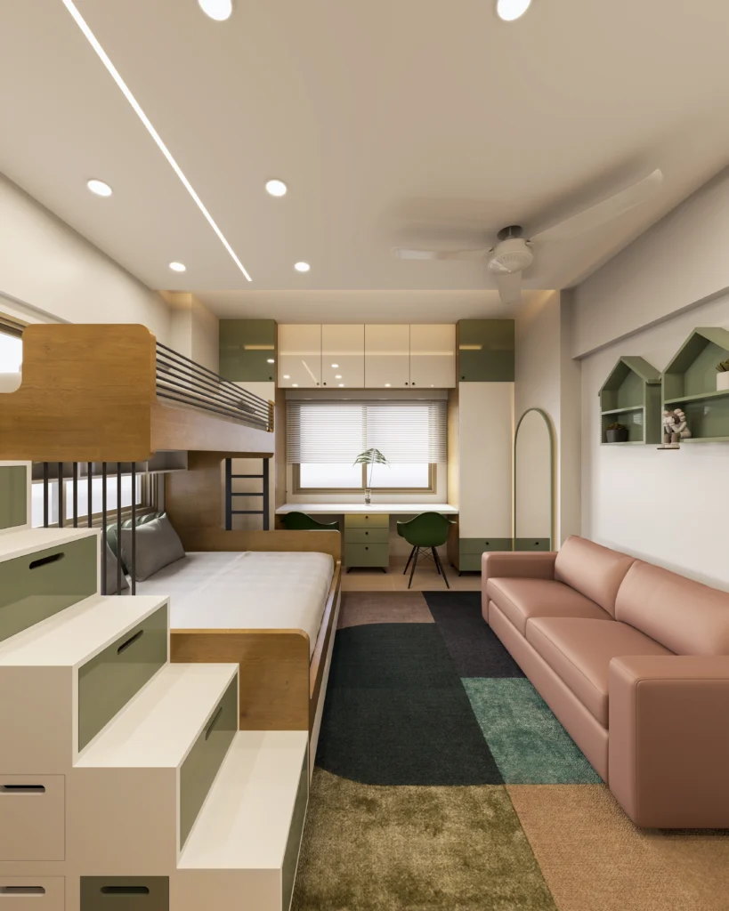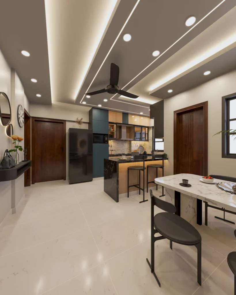 Open-plan lounge and kitchen with warm lighting and elegant ceiling design Fully equipped modular kitchen with high-gloss cabinets and marble backsplash Comfortable sitting room with built-in shelving, neutral-toned sofas, and accent décor Kids bedroom with dual beds, study setup, and ample storage for functionality Use of premium wood-textured flooring throughout the apartment Custom false ceiling […]